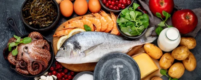 شما همچنین باید رژیم غذایی خود را با غذاهای حاوی ید غنی کنید: غذاهای دریایی (صدف، ماهی مرکب، میگو، خاویار).